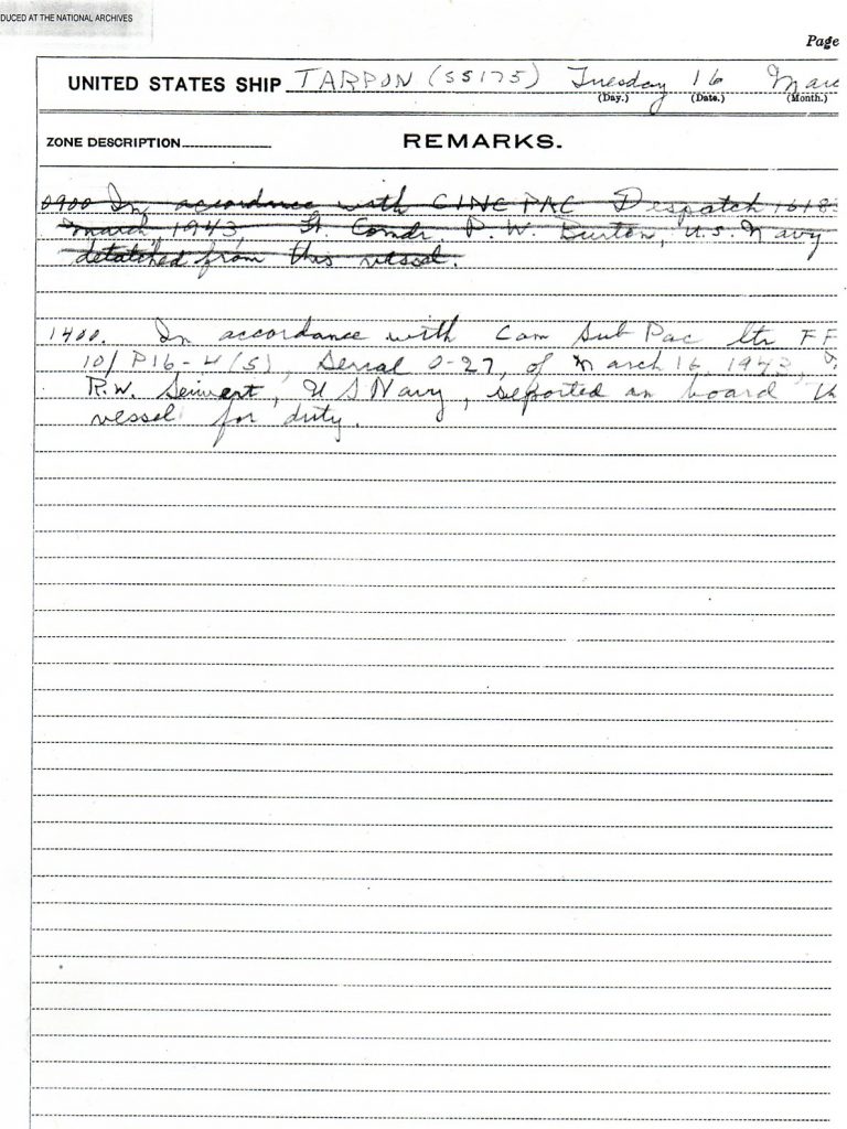 • 10 March 1943 — Tarpon skipper Thomas Lincoln Wogan writes letter to Commander Sub Force, Pacific Fleet, recommending that Burton’s designations as “qualified for submarine duty” and “qualified to command submarines” be revoked.