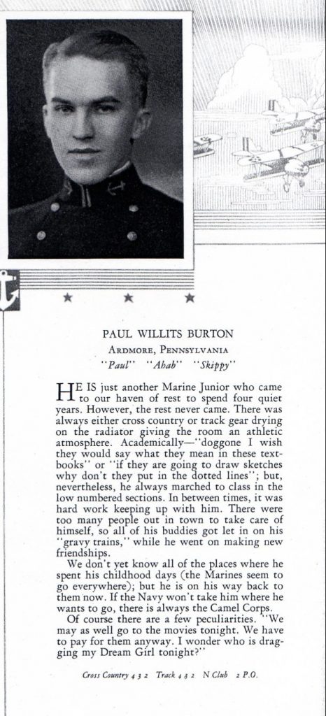 Paul traveled extensively with his family as a child, following his father to postings in the Philippines and China. The Burtons were in Manila in 1914, Kobe, Japan, in 1915 and Peking (ie, Beijing) in 1916 and again from 1923 to 1925. Paul attended grammar schools in Oakland and Philadelphia, junior high school (or its equivalent) in Peking, and high school at the Haverford School in Haverford, Pennsylvania, outside Philadelphia. In 1929 he enrolled at the US Naval Academy in Annapolis, Maryland, where he ran track and cross-country. He graduated in 1933.