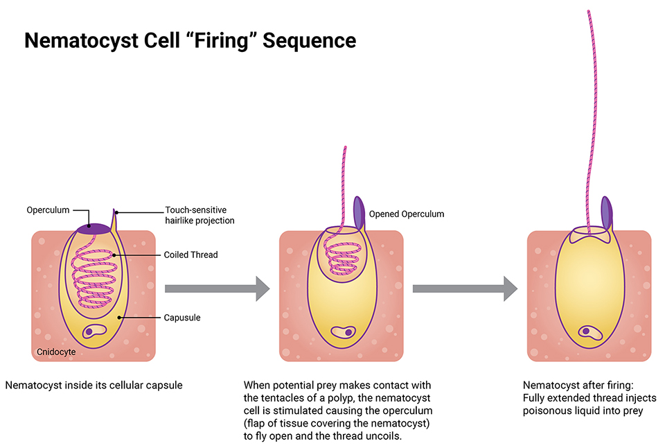Often referred to as Midway Island, Midway is in fact an atoll containing two main islands, Eastern and Sand, and a smattering of tiny islets. An atoll is a coral reef, usually more or less ring-shaped, and the lagoon it encircles. The coral that forms a reef consists of the aggregated calcium carbonate exoskeletons of primitive little sea creatures called polyps. A typical coral polyp has a profile not unlike that of a paper sack wearing a medieval jester’s cap. The cap, however, is no joke. It consists of tentacles tipped with venomous stinging cells called nematocysts by means of which the polyp seizes prey. As primitive as polyps are—they consist of little more than a mouth, a stomach and a mop of these tentacles, and have undergone no significant evolutionary change over the last half a billion years or so—the nematocyst is a barbed marvel of mechanical brutality straight out of a medieval armory. The polyp discharges it like a harpoon in a small fraction of a second, inserts a tube from it into its prey, often a small crustacean or fish larva, injects its victim with a paralyzing agent, draws it in by its tentacles to its mouth and devours it. Coral can be deadly to tiny sea creatures and mighty warships alike.