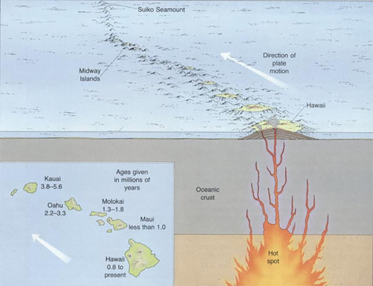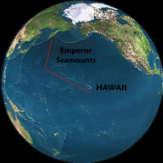 Eighty-two million years or so of tectonic sliding has brought Meiji Seamount (a seamount is an underwater mountain), the oldest and northernmost volcano in the chain, to the brink of the Kuril-Kamchatka Trench just off the coast of Siberia’s Kamchatka Peninsula. The northern flank of Meiji has reportedly slipped into that trench and is undergoing subduction beneath the far western reaches of the North American Plate. If there were older peaks in the chain, they have already met that fate. Meanwhile more than eighty other volcanoes, almost all of them similarly submerged, are slowly gliding to their doom behind Meiji in a line 3,600 miles long that describes the wings of a bird in flight, Meiji representing one wing tip and the Big Island of Hawaii the other; and a new volcano, Loihi Seamount, is building about 22 miles off the south coast of Hawaii. It has climbed about two miles from the ocean floor to within about two-thirds of a mile of the surface and, if current trends continue, one day ten thousand to a hundred thousand years from now it will break that surface and give the state of Hawaii a new island or merge with the island of Hawaii and give it some dramatic new acreage.