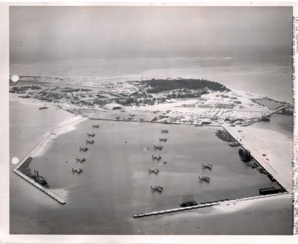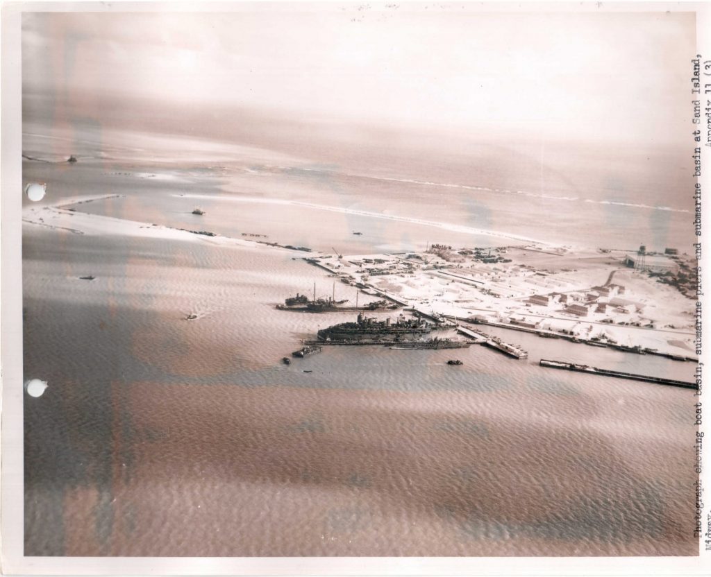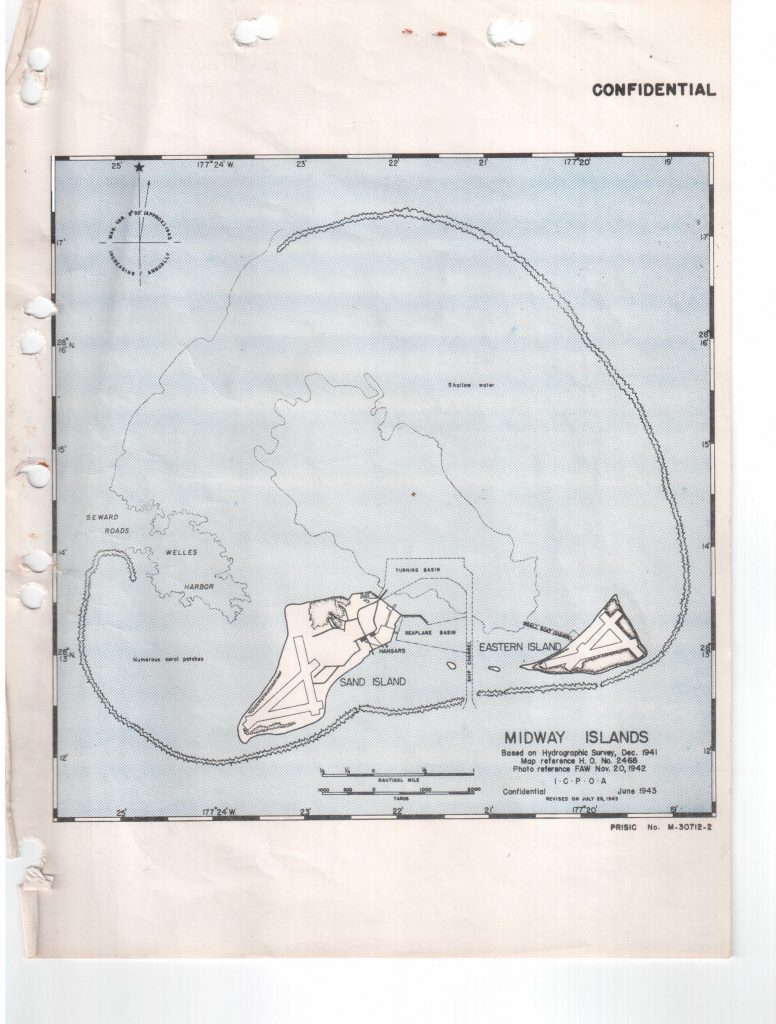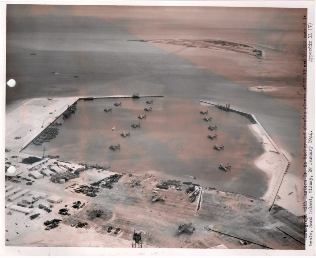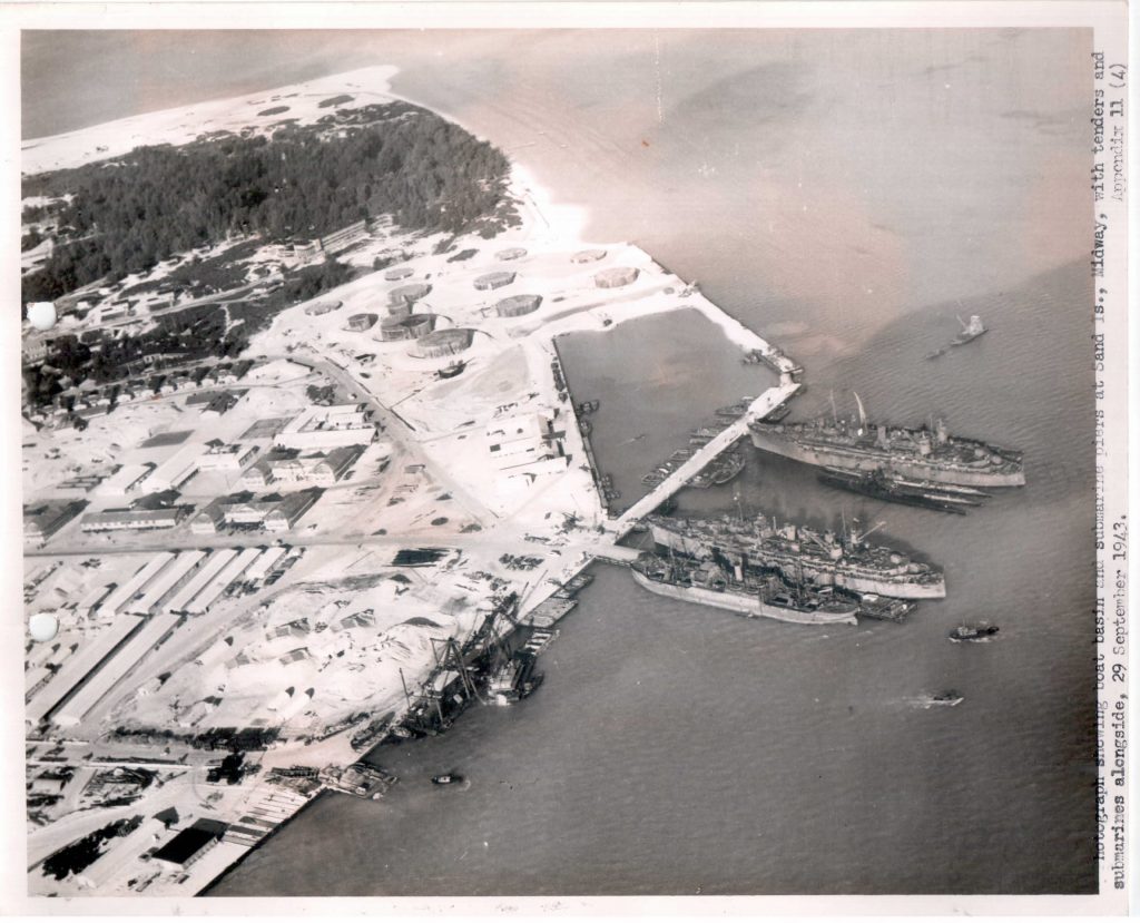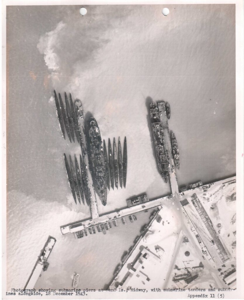 ‘Midway the Middle’—wartime map showing distances to Midway (courtesy NARA San Bruno)Chart based on December 1941 hydrographic survey, revised June 1943 (courtesy NARA San Bruno)Aerial view of Midway ca. 2008. The runways on Eastern Island appear to have faded from disuse. The Navy left Midway in 1993. The atoll and the waters around it are now part of the Papahanaumokuakea Marine National Monument. (Photo courtesy US Fish & Wildlife Service/NOAA)The submarine/seaplane basin, 29 January 1944. Based in Hawaii, these PB2Y Coronados were using NOB Midway as a staging area for 2,100-mile roundtrip bombing raids on Japanese-occupied Wake Island at the time. Rearming boat No. 3, manned by Edward Pitta and Ernest Samed, may have been ferrying men to these planes in preparation for the return flight to Hawaii when they were told to look for Macaw survivors in the channel the morning of February 13. (USN photo courtesy NARA)Same day, different angle. The Macaw lay pinned to the reef at the mouth of the channel, just out of view to the right at the time. The Contractor’s tower, the converted water tower from which Captains Connolly and Edmunds monitored the sinking of the Macaw, appears at the center of the bottom edge of this photo. (USN photo courtesy NARA)In this photo, taken 29 September 1943, at least four submarines, three to port and at least one to starboard, lie alongside a submarine tender docked just outside the small-boat basin at the eastern end of Sand Island. The small-boat basin was an enclosure within an enclosure, the outer one being the reef that encircles the lagoon. On the evening of 12 February 1944, as the Macaw was sinking, a tide gauge in the small-boat basin registered two-foot swells. (USN photo courtesy NARA San Bruno)Undated wartime photo showing the small-boat basin on the right, the submarine and seaplane basin on the left. At the upper left corner of the photo a ship is negotiating the entrance channel. The feint white transverse line in the near distance marks the reef. (USN photo courtesy NARA San Bruno)Submarines and sub tenders docked pointing toward the small-boat basin at the eastern end of Sand Island, 18 December 1943. (USN photo courtesy NARA)Wartime view of Midway from the southwest. Exact date unknown, but the finger of what appears to be foam projecting more or less horizontally from the eastern edge of the channel entrance may be a wave washing across the largely submerged Macaw. (USN photo courtesy NARA)