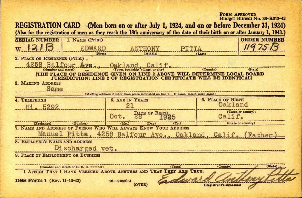 Edward Pitta returned to California after the war and proceeded through a series of jobs—gas station attendant, factory worker, cannery worker, produce buyer, construction foreman, fisherman; lost at least two fingers in another ill-fated rescue attempt, trying to free a coworker’s arm from machinery in a rubber products factory; and survived another shooting, this by one of his six wives at their home in Fort Bragg in 1977. He and his wife both told the police that the shooting was accidental, like the one in the brothel in Stockton decades earlier, and no charges were pressed. Pitta died in November 2009 at the age of 86.