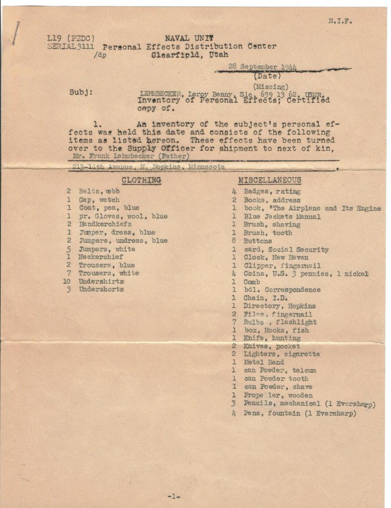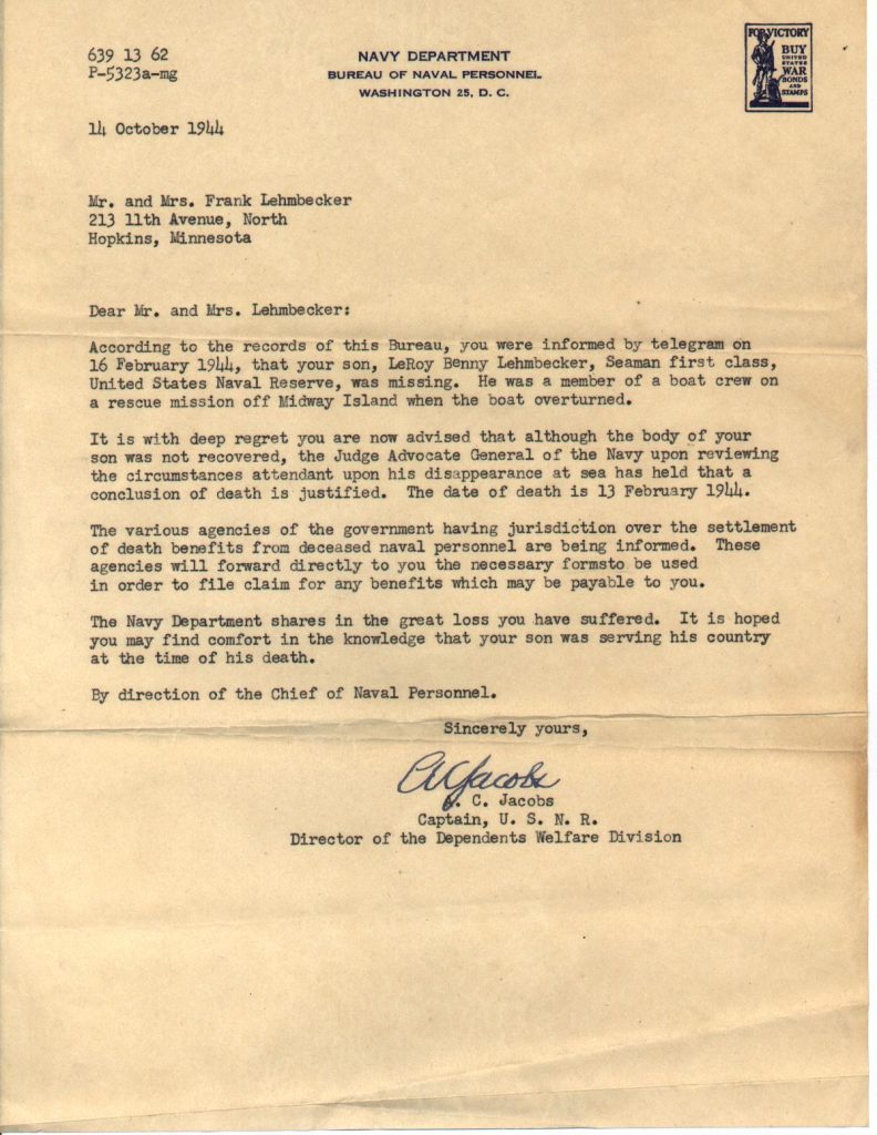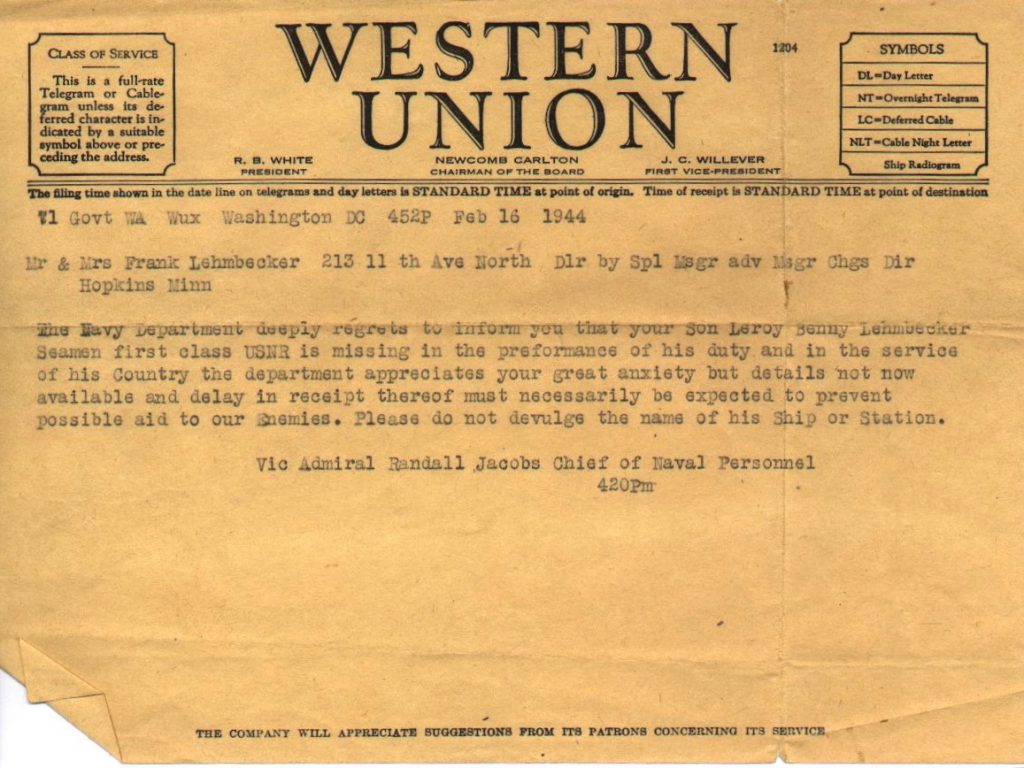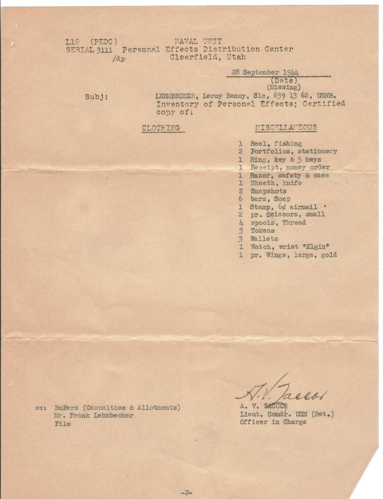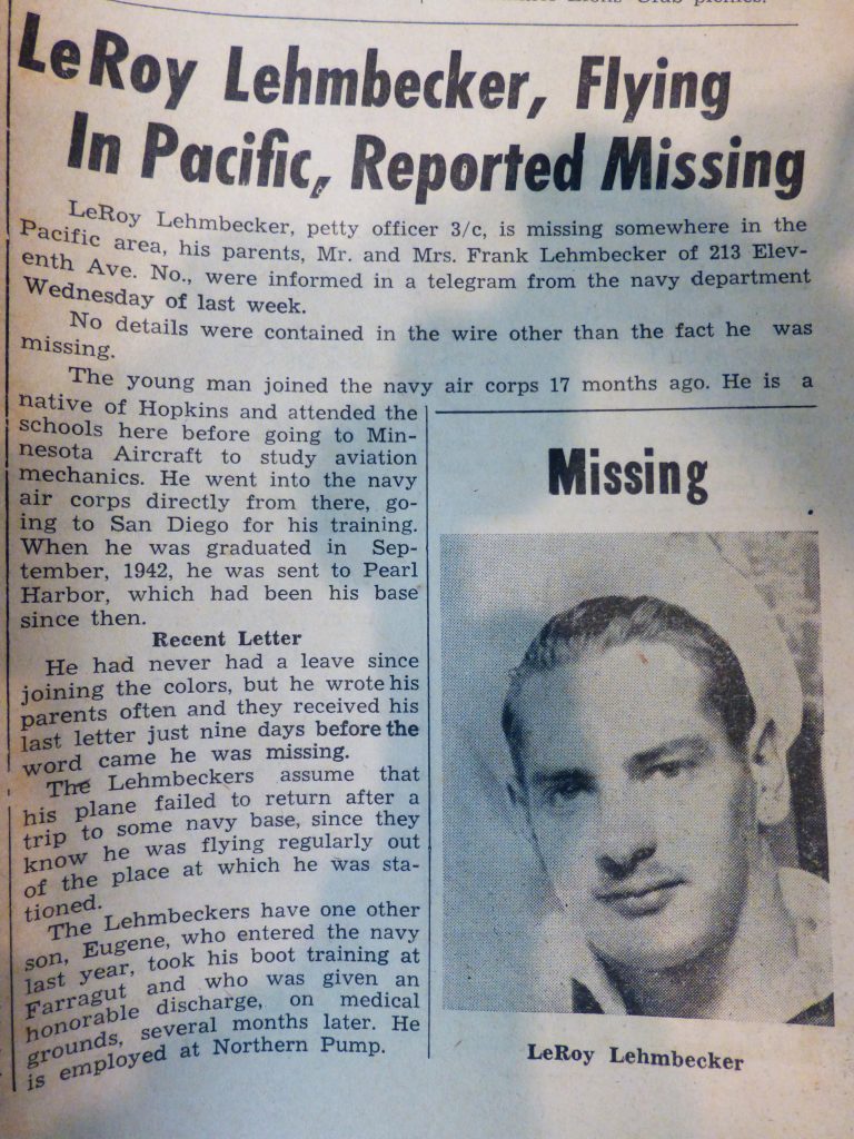 Shirley Hutchenson said 62 years later that if LeRoy had brought her the ring he had told her he had for her, she probably would have accepted it. LeRoy’s mother refused for some time to accept word of his death. “My grandma always felt he’d be coming around the corner,” LeRoy’s nephew Gene Lehmbecker said. His disappearance left his parents bitter toward the Japanese. “If something was made in Japan, they just had a fit,” Gene said. “It couldn’t be in the house.” LeRoy’s death “basically just ruined their life.”