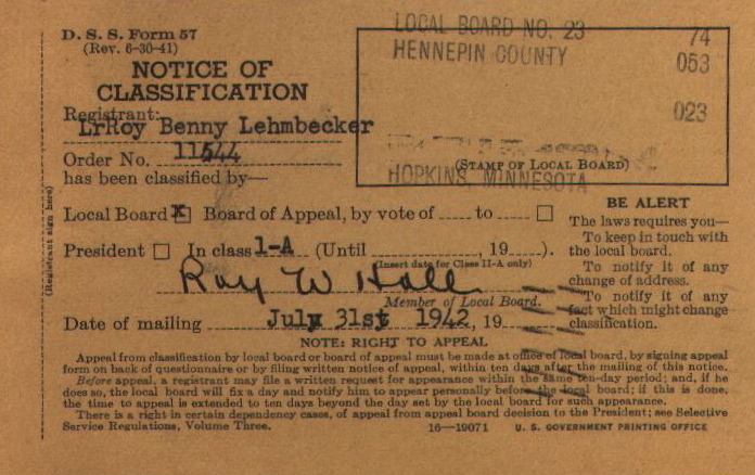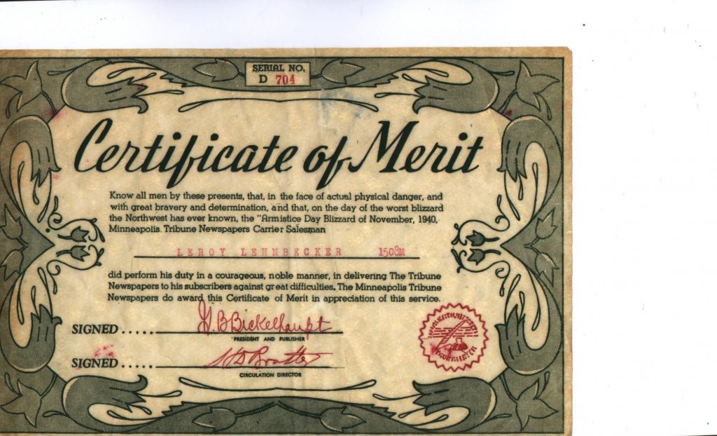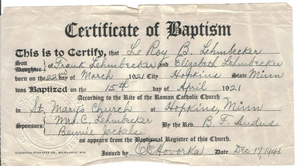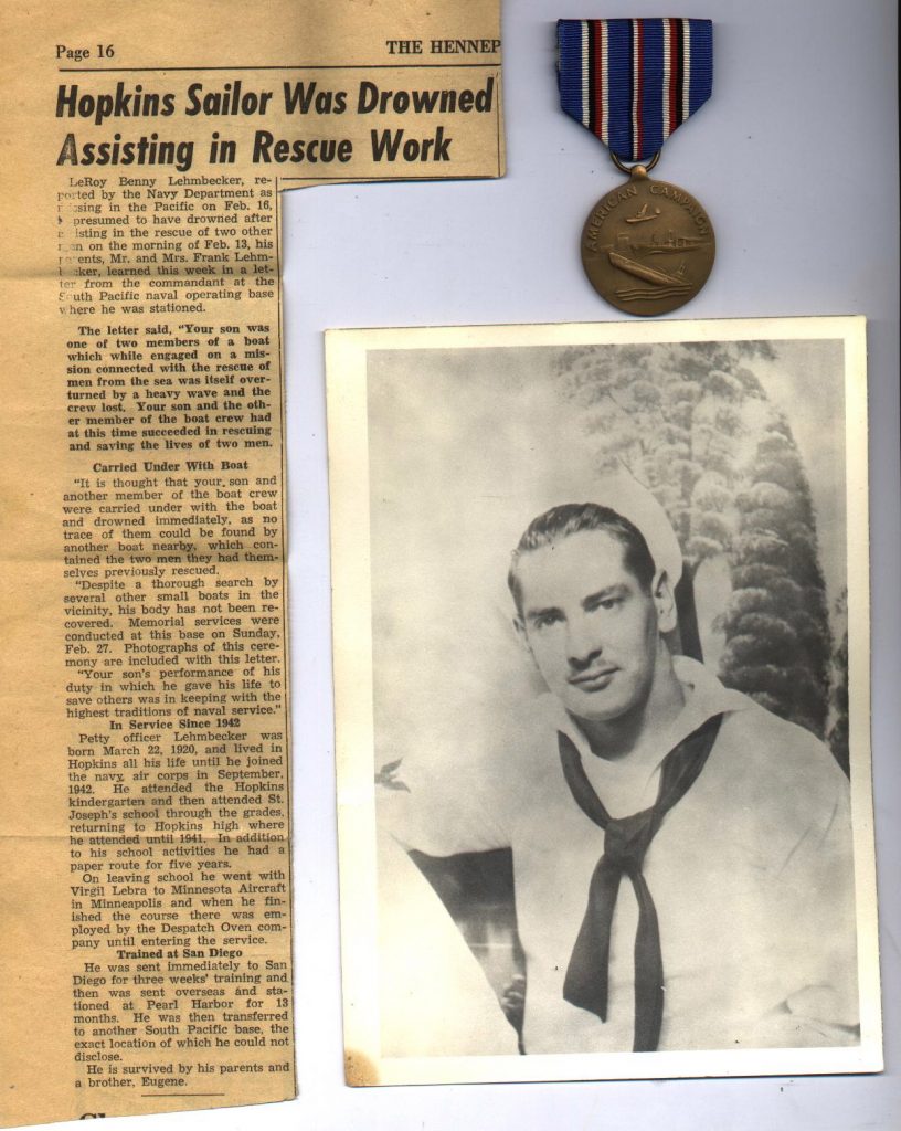 LeRoy Lehmbecker was from Hopkins, Minnesota, a suburb of Minneapolis, the older by about a year of two sons of a machinist for a farm implements firm and his wife. A hunting family, during the Depression the Lehmbeckers often supplemented their diet with blackbird. Standing just over five feet seven inches tall when he enlisted, LeRoy was nicknamed Pee Wee. He liked to tinker with radios. He delivered the Minneapolis Tribune for five years in his teens. The paper awarded him a certificate of merit for making his deliveries “in the face of actual physical danger, and with great bravery and determination” during the Armistice Day blizzard of 1940.