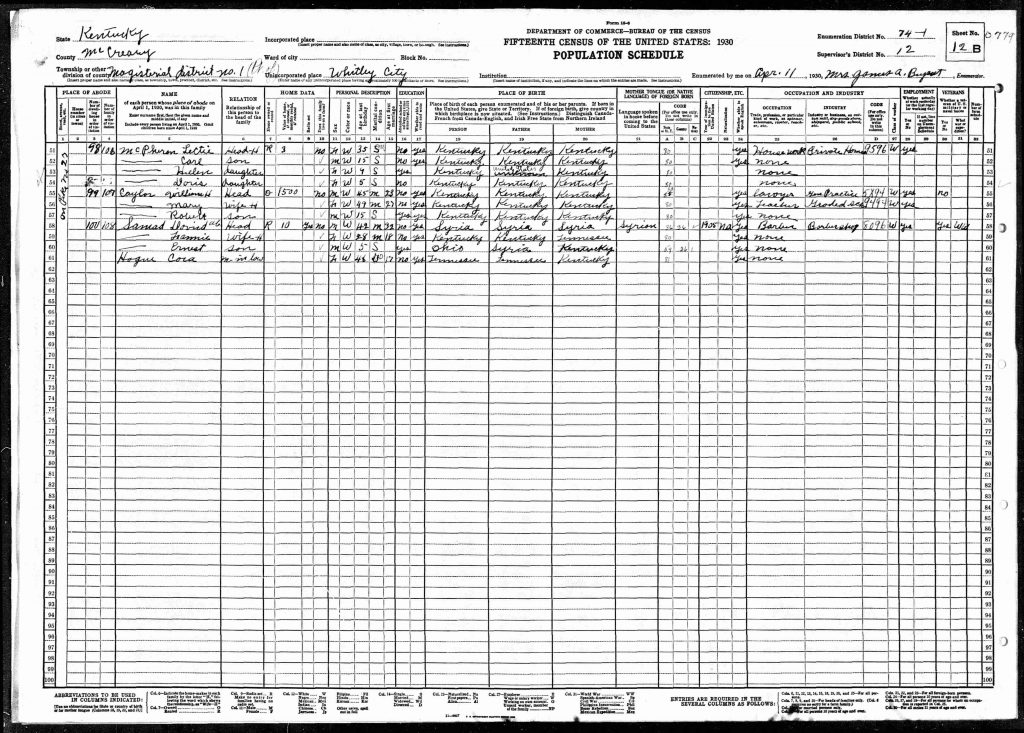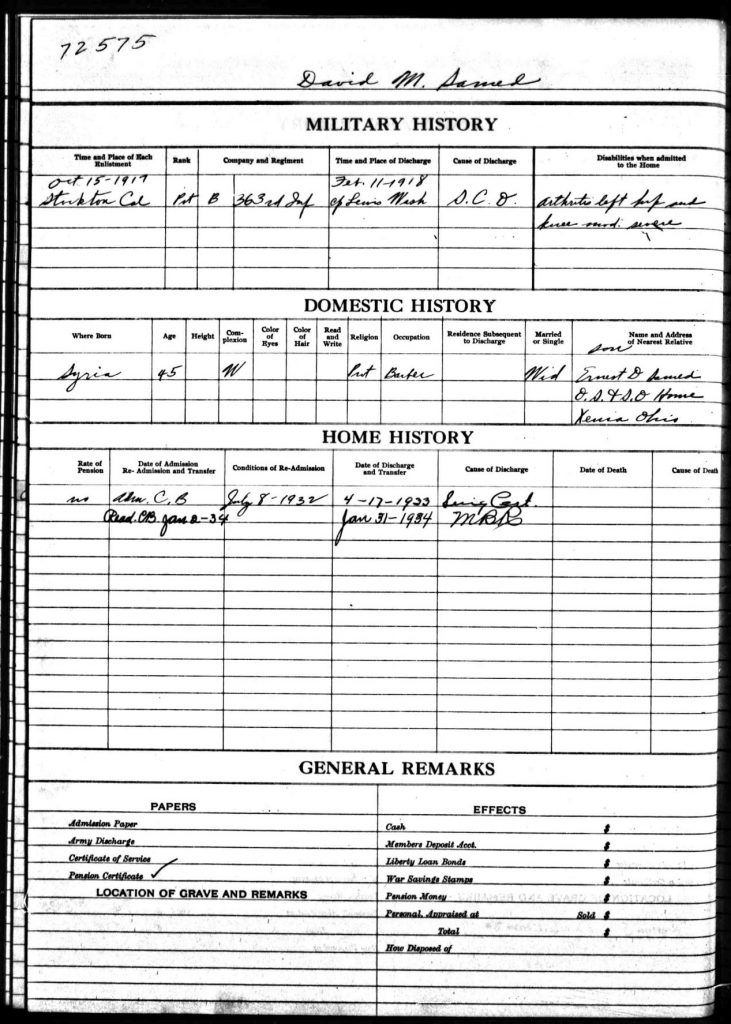 By 1930 the Sameds were living near Fannie’s family in Whitley City, Kentucky, in the southeast corner of the state, and David had resumed his career as a barber. After Fannie died of tuberculosis in 1931, David and Ernest moved to the Old Soldiers’ and Sailors’ Orphans’ Home in Xenia, Ohio. Ernest enlisted in Cincinnati in November 1941. Whether he was still living in Xenia at the time is unknown.