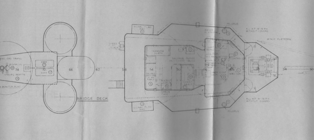 The outer fourteen-sided polygon on the right side of the diagram above represents the bridge deck of a Chanticleer-class ASR. The inner polygon, resembling a pill bottle lying on its side, comprises the pilot house (the cap, forward) and the chart room (the bottle proper, aft). They were the two highest fully enclosed compartments on an ASR, and because the Macaw ran aground conventionally bow first, causing the bow to tilt upward and the stern down, in the ship’s time on the reef the pilot house was slightly the higher of the two. So it was there that the 22 men aboard the Macaw congregated on the evening of 12 February 1944 as their ship began to sink.